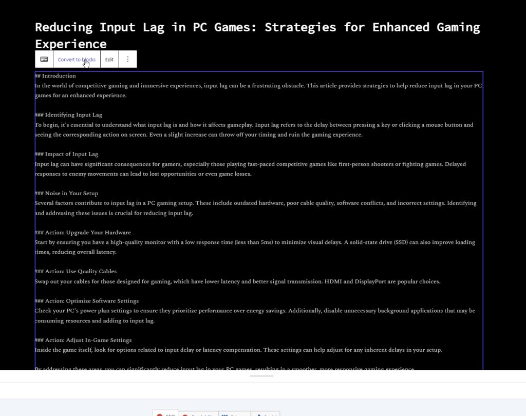 WordPress receives the draft via REST API using application passwords. The post lands as a draft with the title and content populated. Metadata includes focus keyphrase, slug, tags, category is appended as a readable block at the bottom of the draft content. The editor sets those fields manually during the review pass.