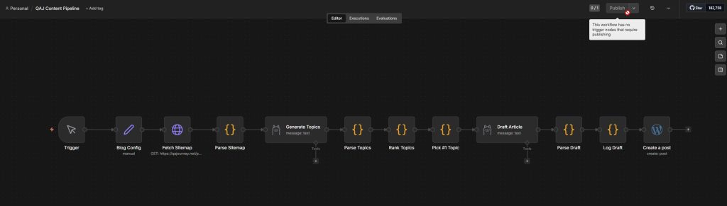 This is not a fully autonomous publishing pipeline. It is not trying to be. The goal is a backlog of structured drafts that reduce the blank page problem across six blogs simultaneously.
