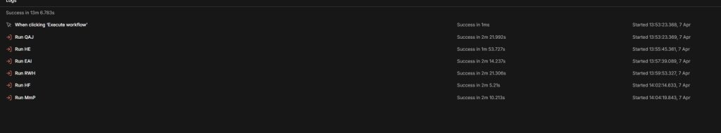 The full pipeline runs in approximately thirteen minutes for six blogs. One trigger, six sub-workflows running in sequence, six drafts landing in six different WordPress instances as unpublished drafts. I review the drafts on own my schedule and publishes what passes the quality bar.